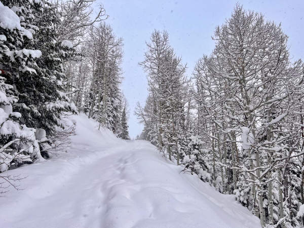 We continued on through the pine forests and Aspen groves along the Ontario trail as flurries of snow fell. The piles of snow on the trees made for picturesque views no matter where we looked. We got glimpses and heard more about other mining sites through the trees and mountains of snow, such as the mines on Daly Ave, and heard tales about more intriguing characters from Park City’s past.